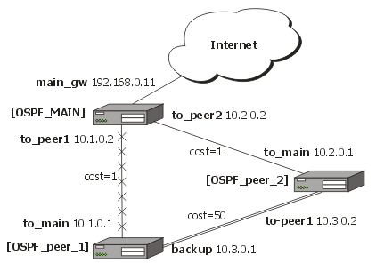 Let us assume that the link between the routers OSPF-Main and OSPF-peer-1 is the main one. If it goes down, we want the traffic switch over to the link going through the router OSPF-peer-2.