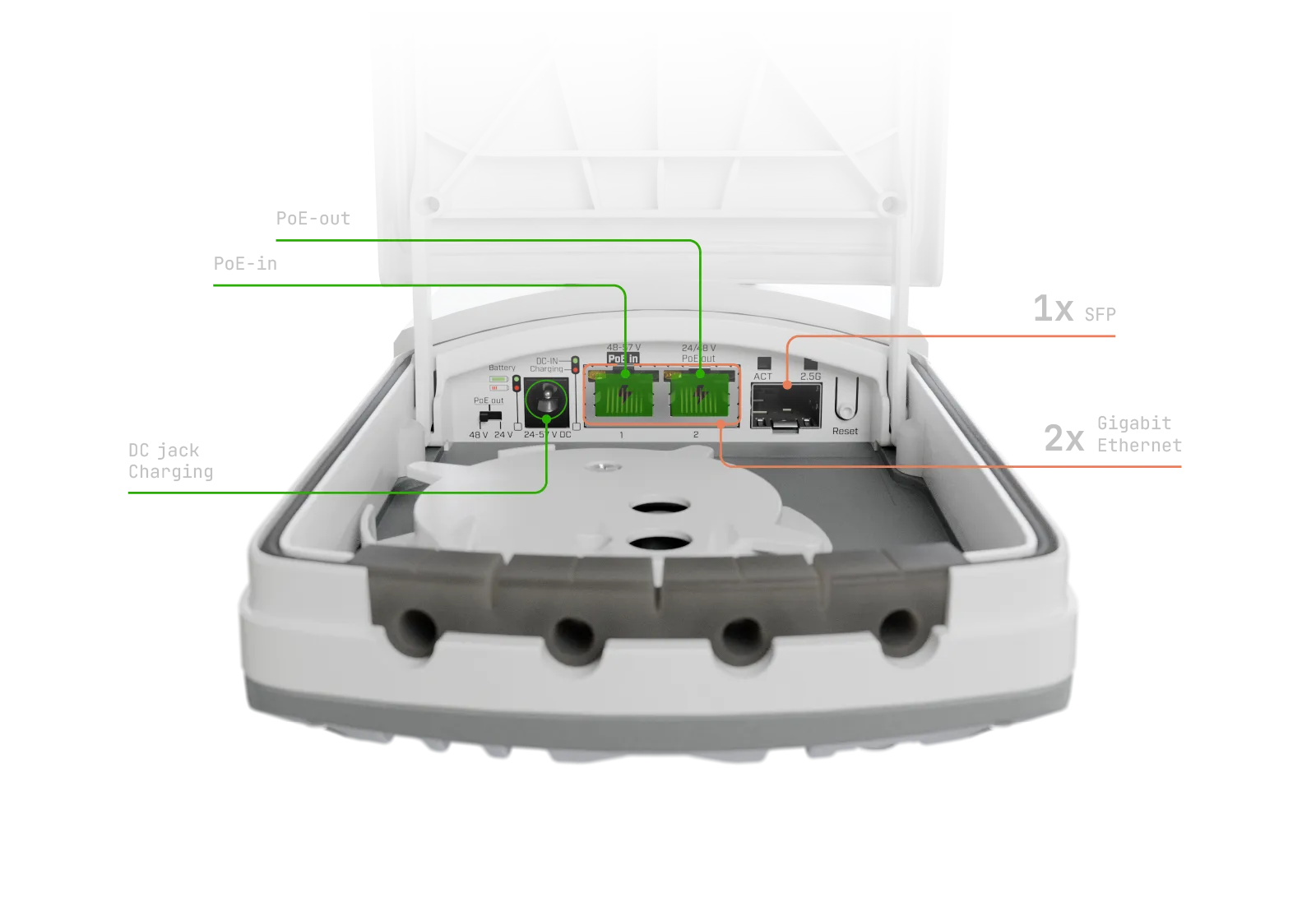 A weatherproof Fiber-to-Copper converter with 2.5G SFP and 2x Gigabit Ethernet ports, including PoE-out on Ether2. Its integrated battery keeps links stable during short power interruptions, preventing unnecessary renegotiations and device reboots.